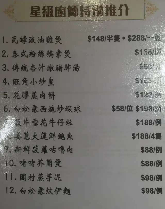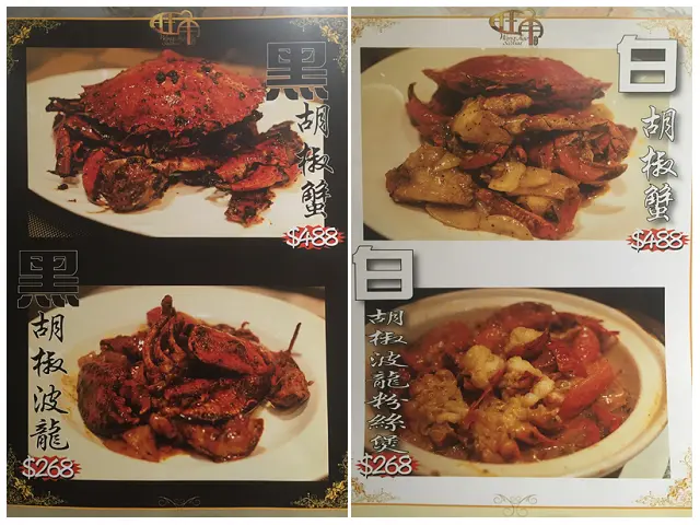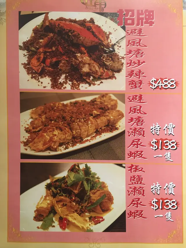 例如:黑/白胡椒蟹或龍蝦、招牌避風塘炒辣蟹等