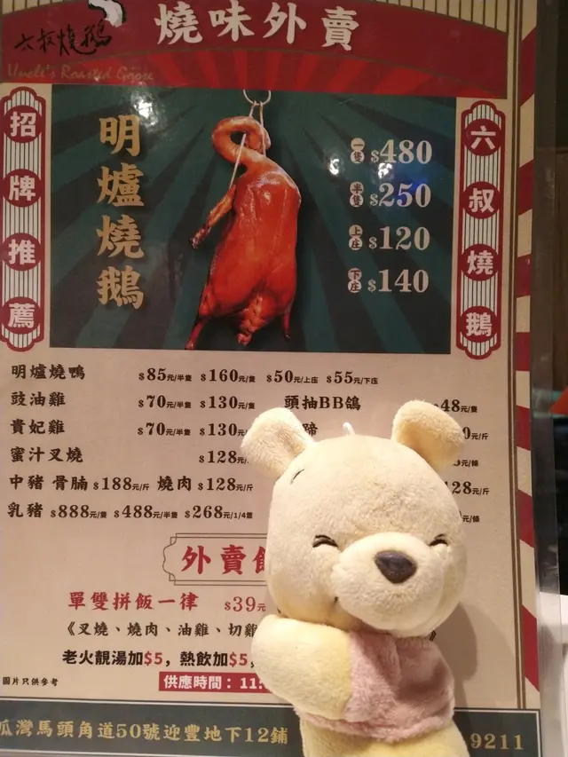 但自從近期係銅鑼灣返工, 係鵝頸橋鄰近食過兩三次質素唔錯嘅燒鵝之後, 身體又無咩痛喎, 豬蹄矛痛喎, 於是心雄膽大咗, 今日就走去屋企隔離街嘅六叔燒鵝同女友小熊開餐.