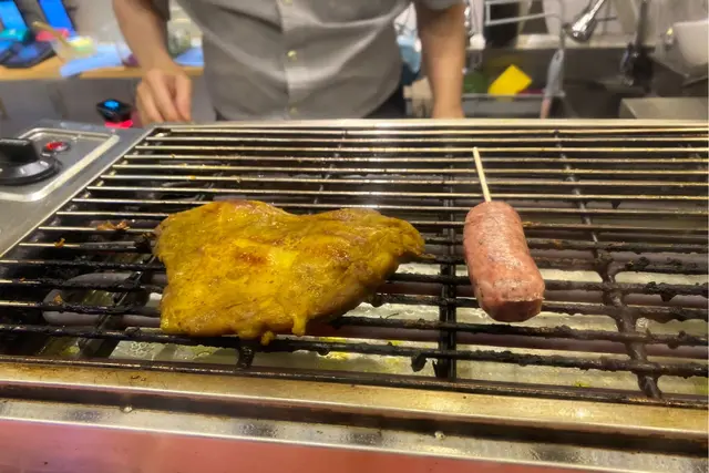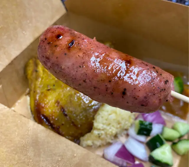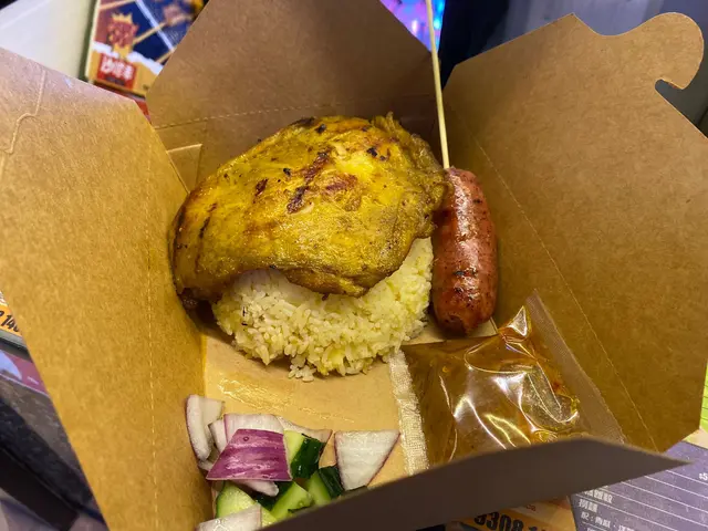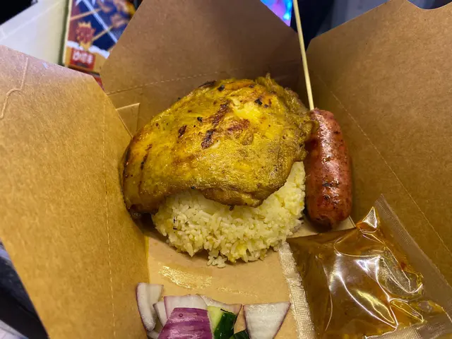 呢日我叫左沙爹雞扒飯($50),午餐價包一包紙飲品,然後再加錢要多左條台灣黑椒腸($12)。🤤🤤