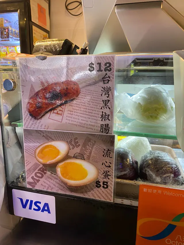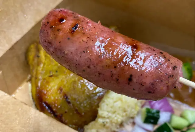 至於台灣黑椒腸外觀呈金黃色,略帶焦糖色,腸膜脆硬但包裹住軟嫩的肉質,配合黑胡椒醬汁,口感味美。