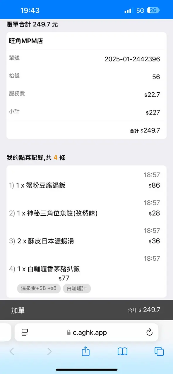 1月24號(星期五),我同媽咪去佢哋旺角MPM間分店度食晚飯,18:57叫2個酥皮湯,孜然魚鮫,湯19:53至嚟到,魚鮫仲等緊,我同媽咪連個白豬、蟹粉飯都食完,莫非啲魚仲未捉到?仲有個所謂濃蝦湯,用成個鐘頭整,出嚟仲要個酥皮,面係燶嘅、裏面又稔又濕,入面蝦仔都冇隻,仲衰過麥當勞,人哋平過佢哋都有幾隻蝦仔,真係連快餐都不如!追個