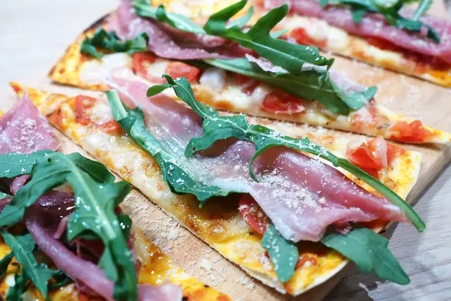 一客四件的薄脆,每塊面頭都加左火箭菜和帕爾馬火腿,食落鹹香味十足餅底又香脆。