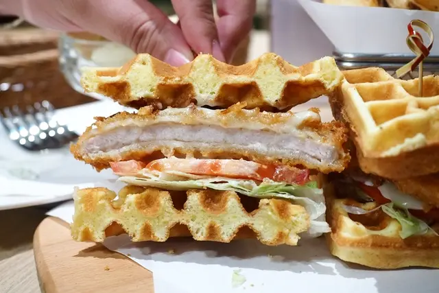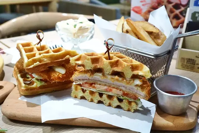 鹹食近來仲多左窩夫三文治的組合,兩塊窩夫中間夾住煙鴨胸、吉烈豬扒、牛肉等,仲會配埋薯角,賣相唔錯又唔貴!
