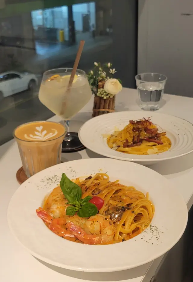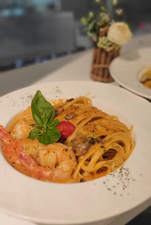 //煎虎蝦香草濃蝦汁扁意粉 $112//
