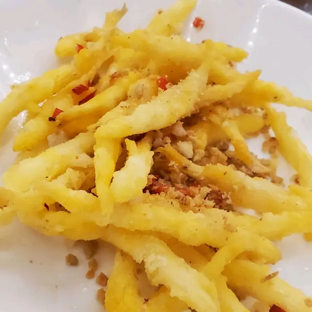 脆漿加了雞蛋,炸出來顏色非常金黃美麗, 條條分明香脆,很惹人垂涎。