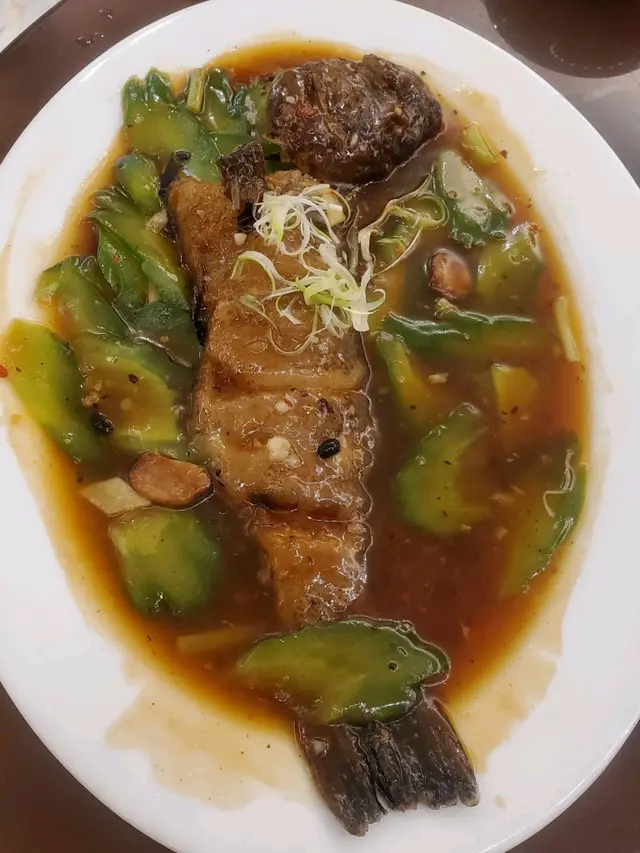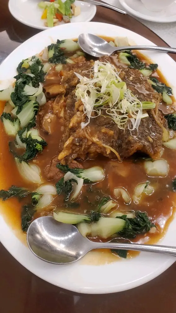 主角終於出場,本著滿懷希望是撥水翅,結果係龍躉邊, 先味不用講,像柴皮一樣, 有少許鹹魚味, 好像急凍了很久, 而且找不到肉吃, 魚肉很少也很乾硬, 後來我們向女負責人反影吃不下去了, 結果她說可換一條涼瓜炆東星斑給我們,可惜, 端出來的是一條西星斑, 結帳的時候還跟我們說沒有多收你價錢, 取消了紅燒龍躉翅,但東星斑和西星斑的價錢是有別, 只求結帳走了,沒有和她再爭拗下去。