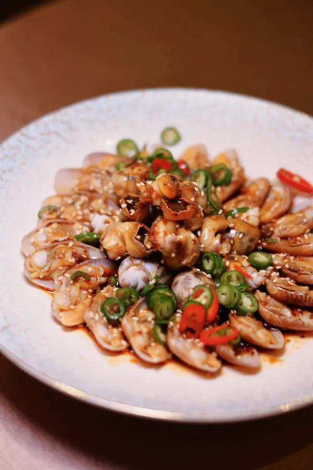 花甲和花螺吸滿花椒汁,微辣入味,花螺爽脆並已去殼。