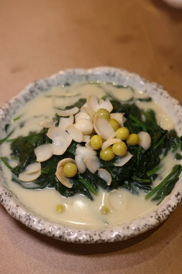 以豆漿做湯底,加入銀杏、百合及杞子,湯底清甜健康,菜苗鮮嫩,屬養生滋補之選。