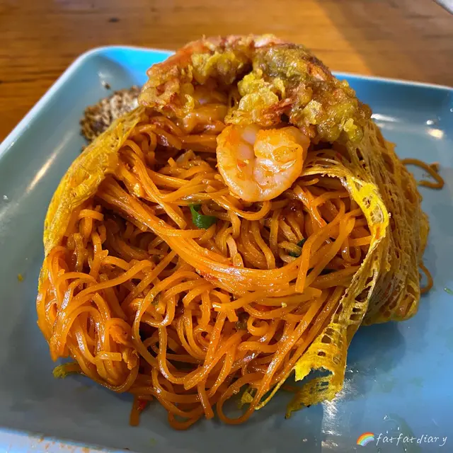 用蛋網包住上睇落的骰,但拆開其實份量驚人。金邊粉味道ok,入面有數隻鮮蝦。而頭頂隻蝦稍稍炸過,咁樣放夠搶眼,但其實放涼左,外面淋左,食落就麻麻喇,不過佢唔係主角沒關係🤣