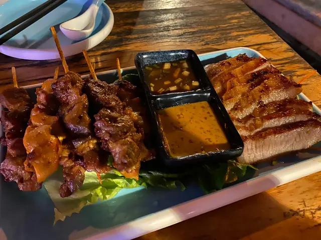 ➱ 1. 串燒拼盤(大)吹着海風,好像要點一份串燒拼盤來邊食邊談才有感覺。我們點了一份大的,共有6串豬、牛、雞,及有燒豬頸肉伴上。串燒還有兩種sauce ,我就覺得串燒沾上傳統沙嗲醬才是最好味。其實單是一份大串燒,都足以令我倆有7成飽肚。