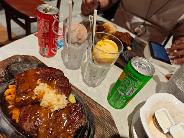 主角「貴族牛扒」登場,鐵板「咋」一聲,香氣四溢,呢個儀式感真係無得頂!嗱嗱聲淋上黑椒汁,煙霧繚繞,氣氛即刻拉到最滿。牛扒叫咗五成熟,切開仲係靚靚嘅粉紅色,肉質鬆化得嚟唔失嚼勁,仲有陣陣炭烤香。雖然係豉油西餐做法,但個汁調得剛剛好,唔會太鹹,反而帶出咗牛肉本身嘅肉味。配埋旁邊嘅炸薯條同灼青菜,簡直係完美配搭。