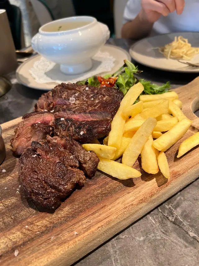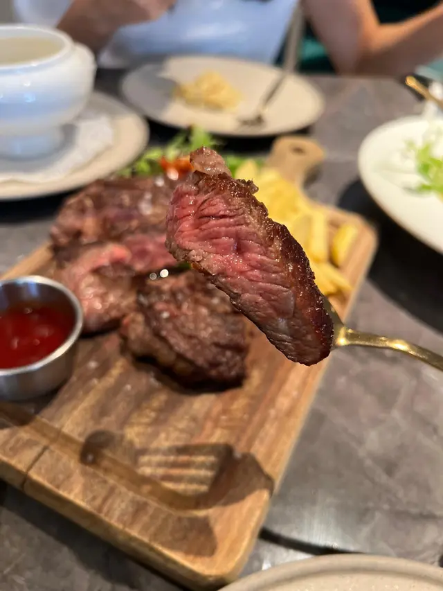 煎到恰到好處嘅格紋,外層帶住啲焦香,成塊扒泛住油潤嘅光澤,睇見都流口水。我哋叫咗五成熟,切開睇,裏面係靚到唔使調色嘅粉紅色,肉汁牢牢鎖住,完全係高手先做到嘅火候!
