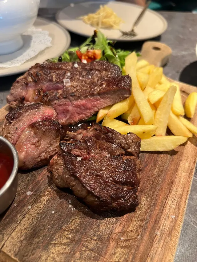 佢本身嘅調味已經好足夠,簡單哋灑咗啲海鹽同黑椒,已經將牛肉嘅原汁原味提升到另一個境界,完全唔需要再多餘嘅醬汁。配菜嘅烤蒜頭同薯蓉都做得好好食,但塊扒先係真正嘅主角!