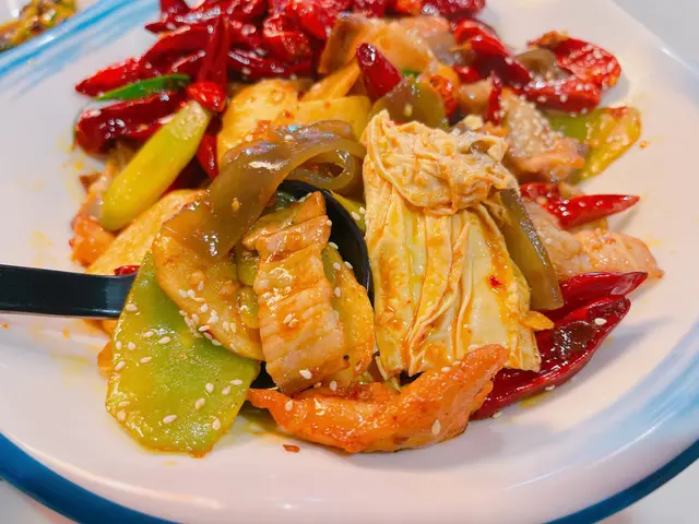 雞球、炸支竹、紅薯粉、鮮准山、萵荀及五花腩片 (微辣,麻辣 - 小麻)
