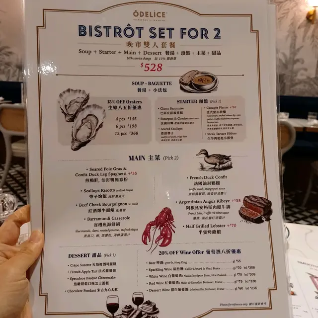 味道及服務俱佳的Odelice Master Taste 8等級42024-05-21142 浏览 关注 Odelice位於商場1期6樓,環境優雅高貴,裝潢富有藝術氣息。餐廳布置講究,桌椅舒適,營造出氣氛極佳用餐體驗。服務員十分熱情周到,我們請他為我們介紹店內既是日推介,見他對菜單和酒水聊如指掌,能夠耐心解答我們的各種提問。最後我們點了雙人晚市套餐($528)。頭盤選巴斯克甜椒煮蜆以西班牙經典調味醬汁巴斯克醬汁烹調,起到了調和蜆肉和甜椒的作用,突出食材本來的鮮味,口感濃郁,層次豐富。主菜是阿根廷安格斯肉眼牛排配薯條及黑松露紅酒醬汁(+$35)及半隻烤龍蝦(+$70),牛排煎至正好,肉質肥嫩多汁,配上黑松露紅酒醬汁更添風味。龍蝦烤得恰到好處,肉質飽滿彈牙。薯條焗得酥脆,與主菜搭配得當。甜品以蕉糖餅乾口味芝士蛋糕作結尾,味道香甜濃郁,為整個生日大餐劃上圓滿句號。期待下次再來Odelice聚會。1巴斯克甜椒煮蜆烤龍蝦烤龍蝦阿根廷安格斯肉眼牛扒配薯條及黑松露红酒醬汁阿根廷安格斯肉眼牛扒配薯條及黑松露红酒醬汁焦糖餅乾口味芝士蛋糕焦糖餅乾口味芝士蛋糕粉紅夢幻&熱帶風情1以上食记乃用户个人意见 , 并不代表OpenRice之观点。1分享味道及服務俱佳的Odelice Odelice! (新城市廣場一期) https://s.openrice.com/QrbT0HOHJ00检举 张贴 评分5味道5环境5服务5卫生4抵食推介美食巴斯克甜椒煮蜆烤龍蝦烤龍蝦阿根廷安格斯肉眼牛扒配薯條及黑松露红酒醬汁焦糖餅乾口味芝士蛋糕焦糖餅乾口味芝士蛋糕粉紅夢幻&熱帶風情用餐日期2024-05-16用餐途径堂食人均消费$350 (晚餐)庆祝纪念生日