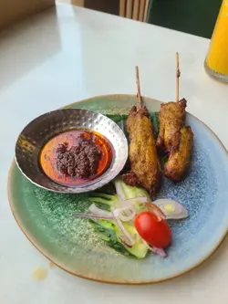街頭雞肉串燒一客兩串,熱辣辣上枱,燒得皮脆啖啖肉,撈埋個參峇醬微微辣,好惹味。伴有車厘茄半粒,洋葱絲同青瓜幾片解膩。