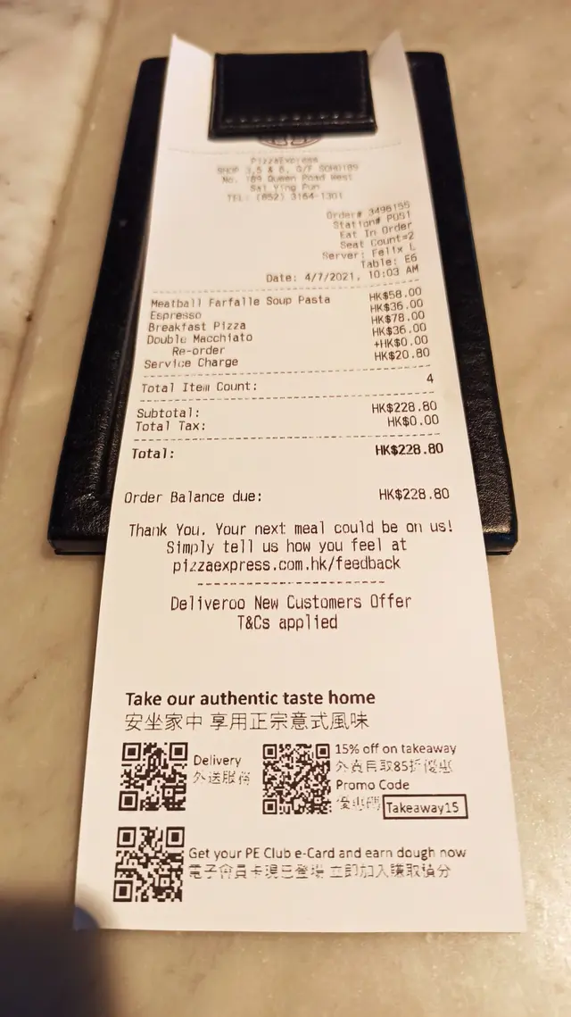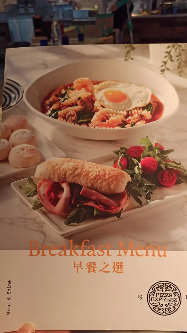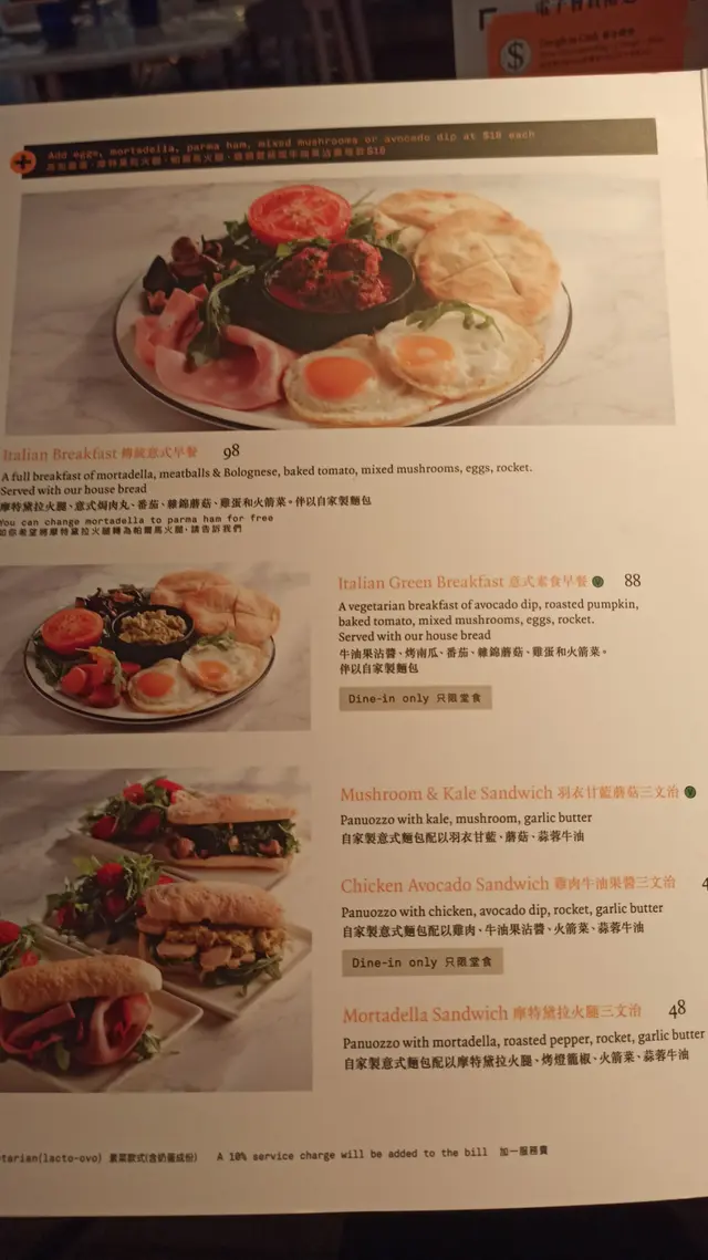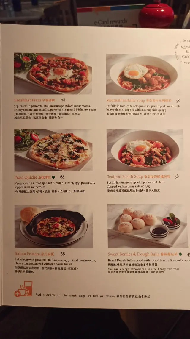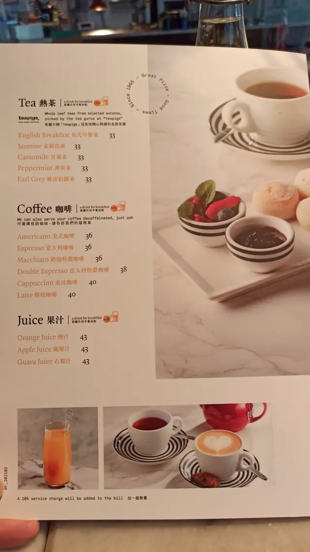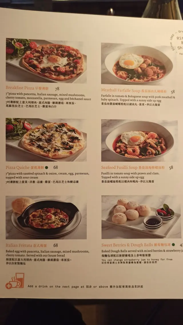 早餐的餐牌與其裝潢一樣,簡潔而集中;在通訊軟件問及好友有什麼推介,答案是基本上都可點,點餐就交由我處理;然後細看了餐牌上的食物一轉,然後問了侍應生(英語對答),提及到Pizza是即叫即做,是必食之選,通常6-10分鐘內做好;於是點了特色早餐Pizza,加上一個蕃茄湯肉丸蝴蝶粉(Farfalle),當然少了不堪稱極為相襯的咖啡(單份的Espresso)!