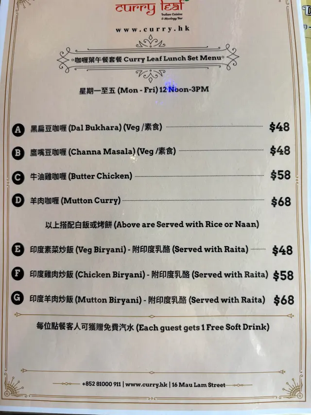 最痴線係個平日午市套餐,下晝三點前,素咖喱連汽水先$48,肉類都只係$58-68,真係抵到爛!加埋個環境行高級路線,雖然有啲金燦燦未必個個香港人鍾意,但坐得好舒服,絕對係物超所值嘅一餐。