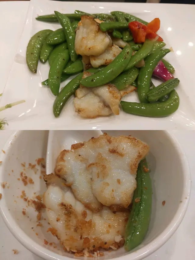 翡翠炒龍躉球,甜豆爽口,肉質有少少老。