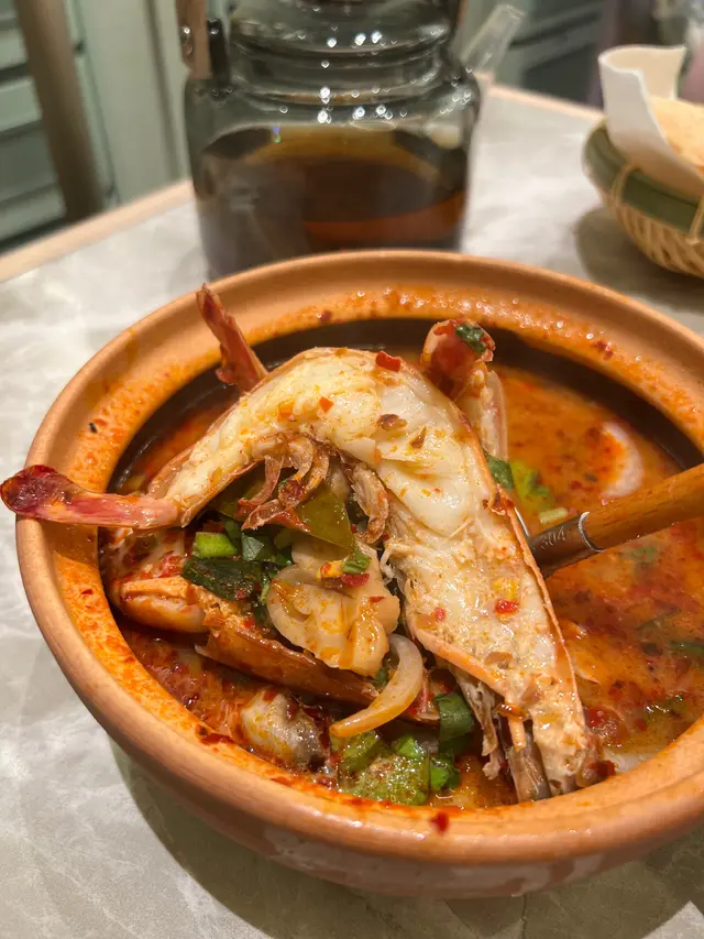 個冬陰功湯幾有睇頭,裡面既大蝦真係好大隻,佢係中間切開左,令到隻蝦既鮮味都入到個湯,同時隻蝦又入曬湯味,個湯就偏酸多過辣🦐🫕