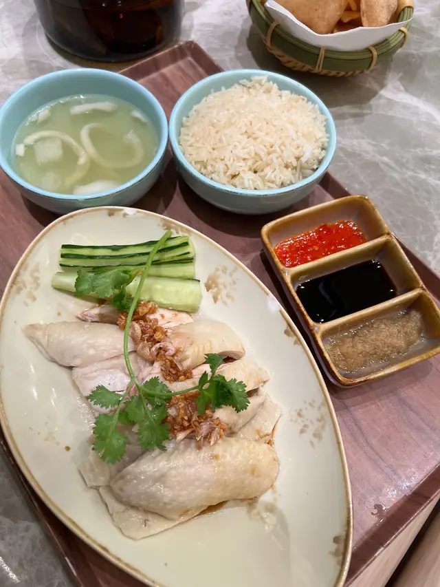 個海南雞個樣雖然好似淡左d,個皮唔係黃色,但食落其實雞肉嫩滑,三色醬齊曬,碗湯係椰子湯,好清甜😋