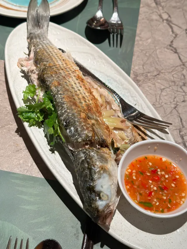 這道菜絕對是當晚的亮點!烏頭魚以鹽焗方式烹調,魚肉鮮嫩多汁,鹽香恰到好處,不會過鹹。魚皮微脆,魚肉則保持濕潤,搭配檸檬汁或泰式酸辣醬更添風味。份量十足,兩個人分享剛剛好,非常推薦!