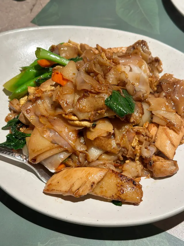 這道炒河粉鑊氣十足,河粉彈牙不黏糊,配料豐富,包括蝦仁、雞蛋、豆乾和蔬菜等。調味偏向甜辣風格,帶有淡淡魚露香氣,整體味道正宗,很有泰國街頭風味。