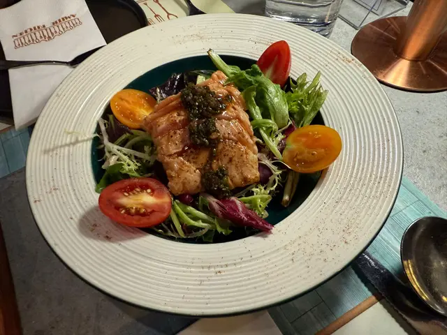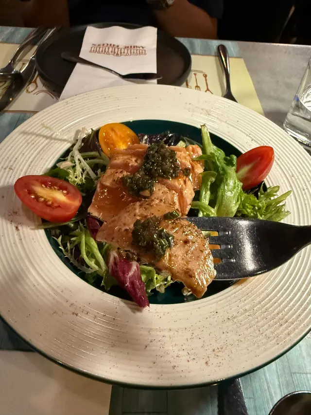 佢哋啲食物呢,絕對係有心思嘅fusion菜。頭盤嗰個「火炙半熟三文魚伴紫蘇莎莎」,一上枱就聞到好香!塊三文魚表面燒到微微焦香,入面就保持到刺身級數嘅嫩滑,半生熟啱啱好。個紫蘇莎莎醬好清新,酸酸地,帶少少紫蘇獨特嘅香氣,同魚油嘅豐腴感超級夾,食落一啲都唔膩,仲好開胃添!