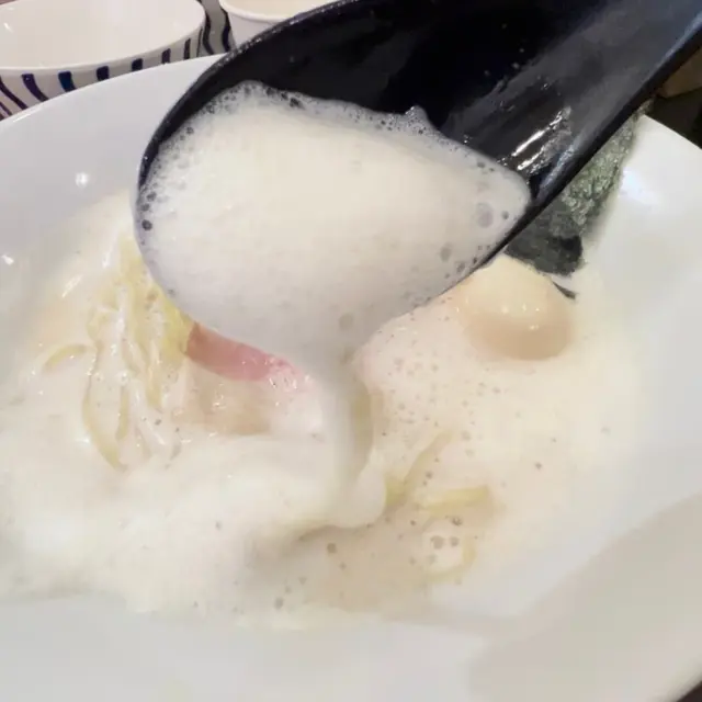 Tori MaMa 除咗對麵食嘅要求好高之外,佢對湯嘅風味都好有堅持。佢嘅雞白湯真材實料,冇落半點牛奶,啖啖湯都係雞嘅精華,十分濃郁,但又唔會好個一pat pat 嘢咁,做到湯嘅臨界點,鎖住晒啲雞味喺個湯度。你哋睇下啲泡泡,幾綿密!佢個雞白湯,我真心覺得一定要飲晒!
