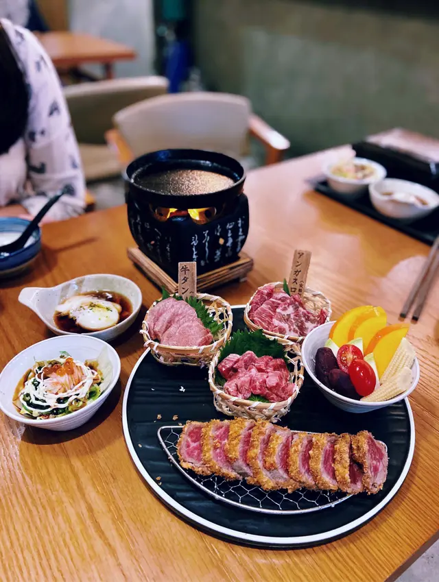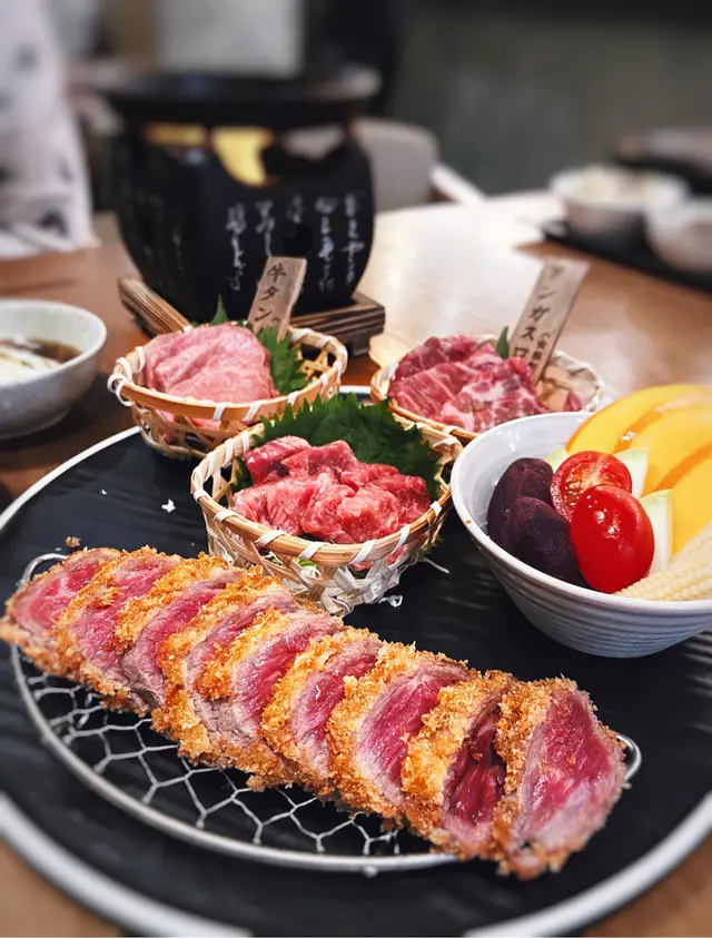 每個套餐都跟牛舌芯片、鹿兒島A5和牛肩胛片 ,以及頂級安格斯牛肉片。很喜歡外層的麵包糠,外皮炸至黃金香脆,吃起來脆卜卜,內裏則肉質嫩滑,油花分佈均稱。而且自己負責燒特別有意思🐂。除牛肉,還有季節野菜盛盒,包括蕃薯仔🍠、南瓜片🎃、翠玉瓜🥬、蕃茄仔🍅