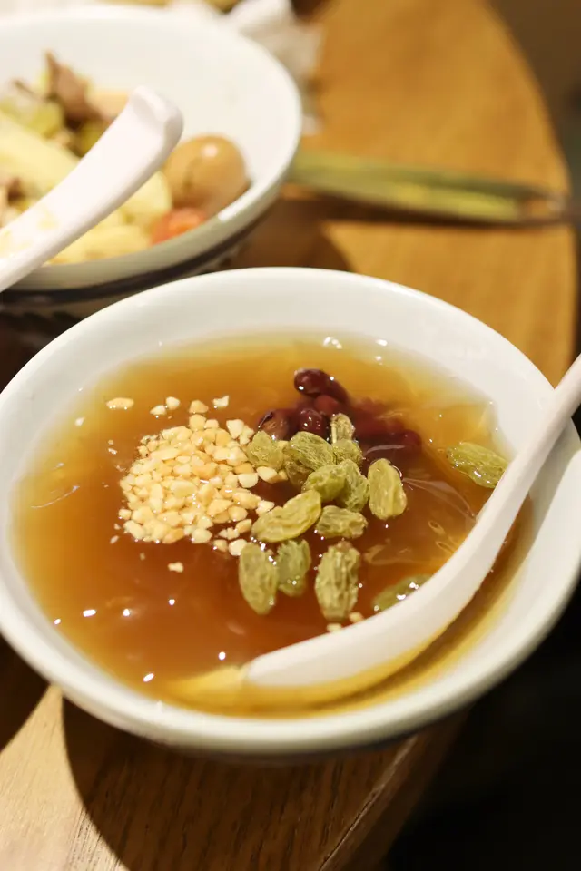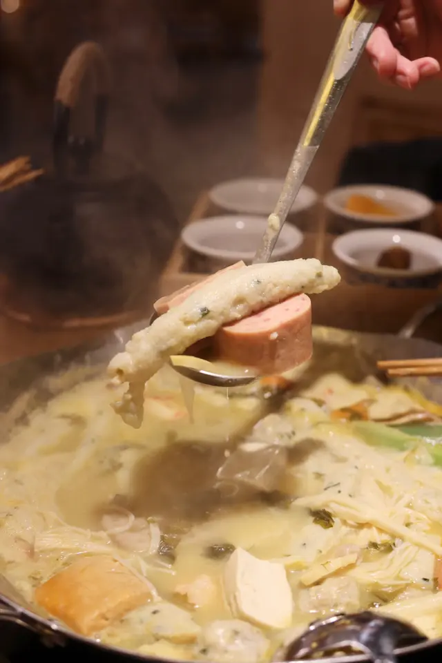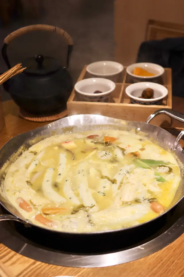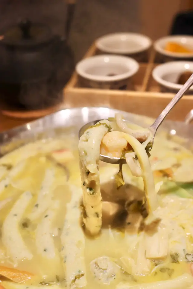 接著,我點了他們的招牌菜之一,鰻魚滑酸菜鰻骨金湯鍋。這道菜以鰻魚滑和酸菜作為主要材料,湯底鮮美,鰻魚滑口感柔軟,不錯。此外,他們還提供了多種醬料,包括蒜蓉、蔥、芫荽、辣椒、辣椒粉、炸蒜、花生和芝麻,可以根據個人口味調配。