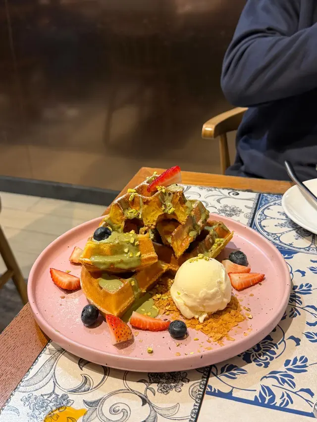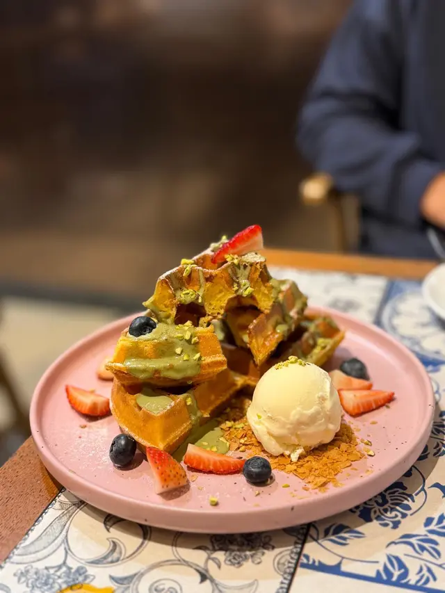 窩夫外脆內軟,開心果茉莉花醬好香好creamy,仲有陣陣茉莉花清香,配香草雪糕簡直完美ending🧇🍨