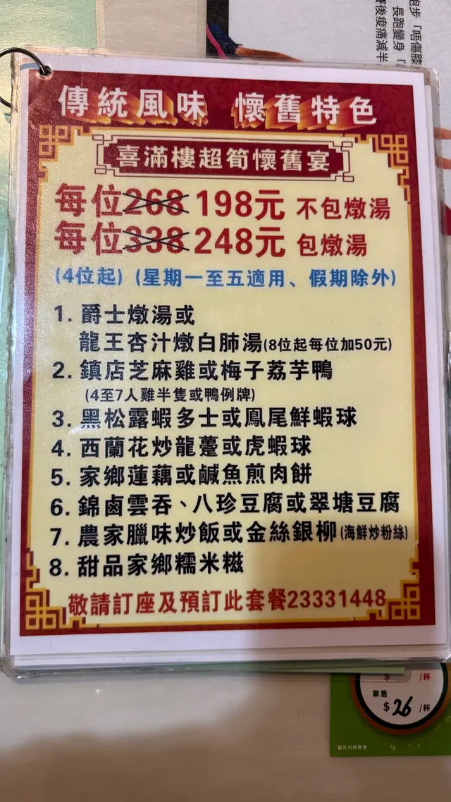 「喜滿樓超筍懷舊宴」每位 198元(不包燉湯) / 248元(包燉湯)。四位起,星期一至四適用,假期除外。敬請訂座及預訂此套餐 23331448 。