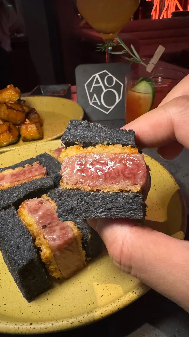 竹炭三明治夾著炸至金黃外皮嘅A4厚切和牛,每一口都充滿油脂,嫩滑口感,入口即溶,非常滿足
