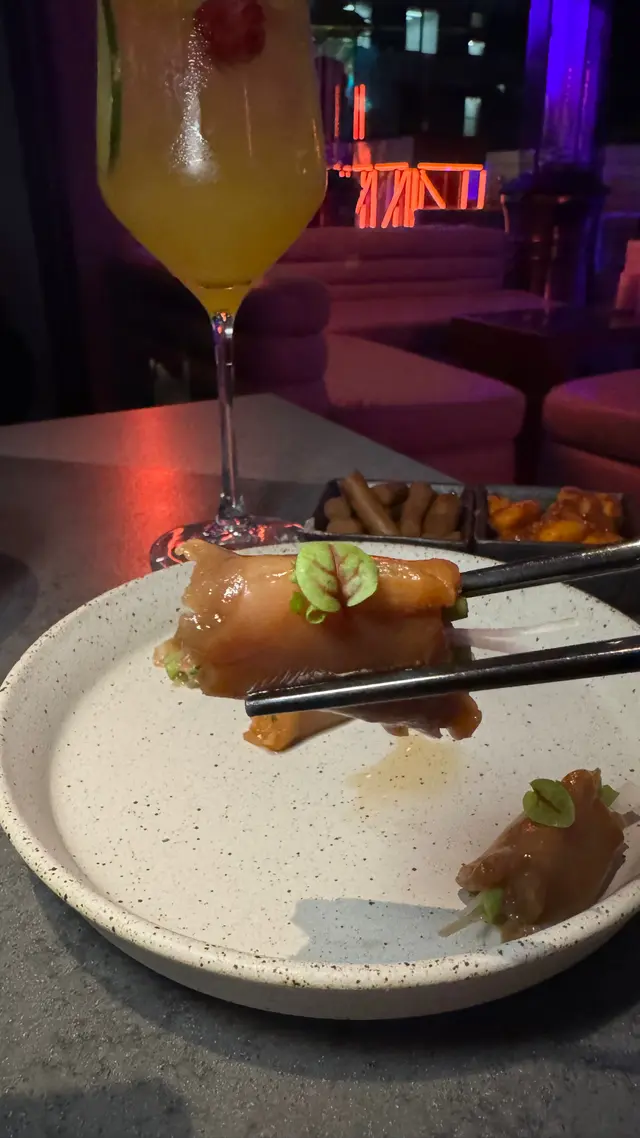 用赤貝肉醃製,配搭微微辣嘅自家製醬汁。入面再包住爽口嘅蘆筍,口感鮮甜清新