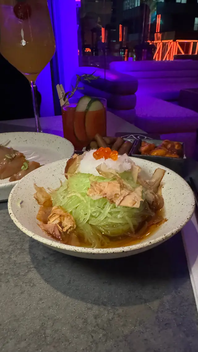 以三文魚子搭配萵苣絲的沙律。萵苣絲如麵條般細長,口感獨特而且特別清爽