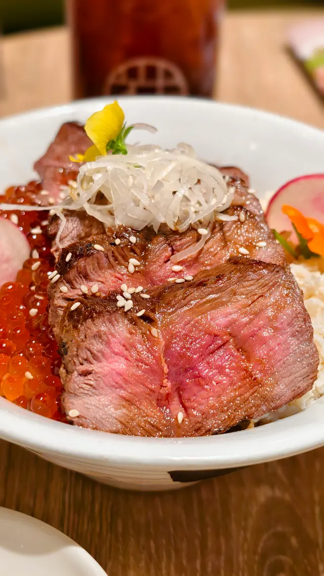一上枱就好霸氣😳,真係「爆丼」名副其實!呢款丼飯有三重主角:牛板腱🥩、蟹肉🦀、三文魚籽🐟。牛板腱經過炙燒處理,外層微焦,肉質保持嫩紅色,咬落有韌勁同肉香;蟹肉帶鮮甜,質感細膩柔滑;三文魚籽鹹香爆汁🤯!三款食材混埋飯一齊食,鮮香鹹香同米香結合,味覺層次超級豐富!