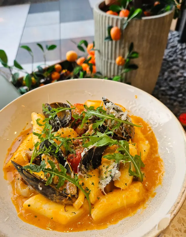 自製玫瑰醬帶點微辣又帶點花香,搭配鮮蝦、魷魚、青口等海鮮🦐🦑,每一口都鮮味十足。年糕Q彈有嚼勁,醬汁濃郁卻不膩😙