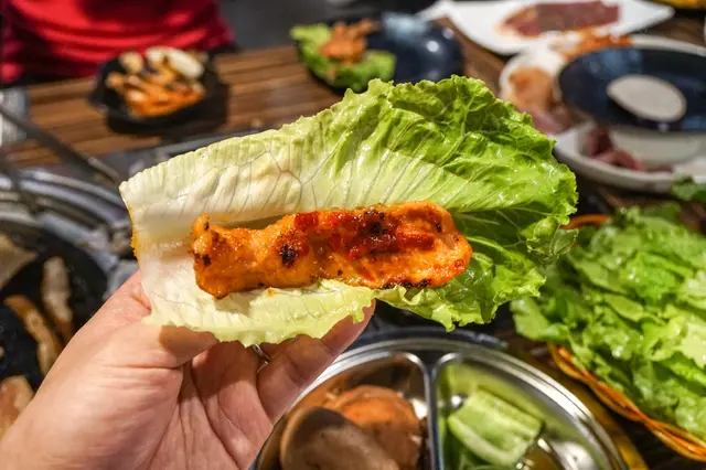 厚切豬腩肉:肉夠厚身,燒緊時會出油,食落好有咬口又香豬油味,點辣醬再夾喺生菜食就一流