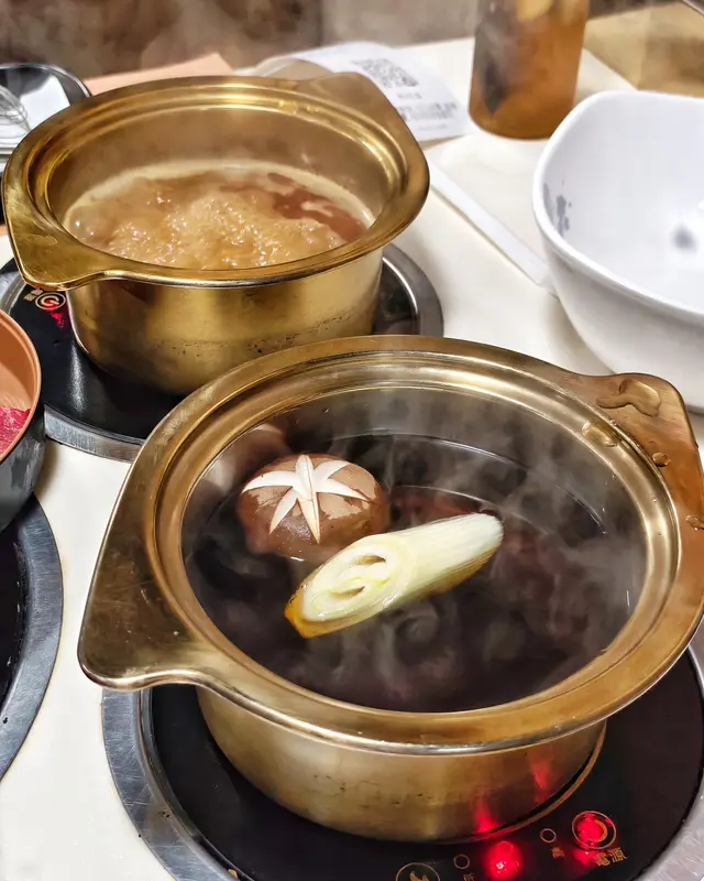 火鍋湯底方面 🍲,佢哋主打「一人一鍋」嘅火鍋模式,乾淨衛生之餘,又可以揀自己鍾意嘅湯底 🥣,呢個設計真係好貼心 💕!我哋揀咗椰香沙嗲湯 🥥 同埋壽喜燒湯。椰香沙嗲湯香濃惹味,帶點微辣 🌶️,用嚟淥海鮮同牛肉都好夾;壽喜燒湯就甜甜哋,淥 🥩 和牛一流。