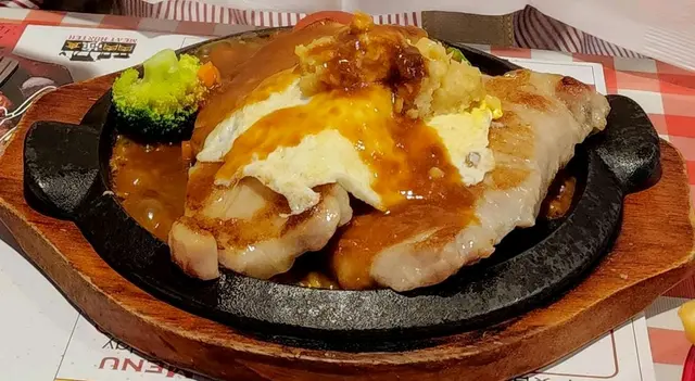隔咗一陣我哋兩份扒餐都好快上,我叫咗蒜蓉汁,但係原來我個沙丹豬扒上面仲有一堆蒜蓉, 好surprise, 因為如果要 蒜蓉粒 出面餐廳一般要另外加錢。個豬扒兩大塊仲有一隻煎蛋,成份餐都好大份好扺食!
