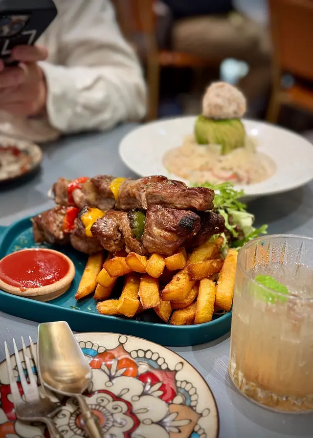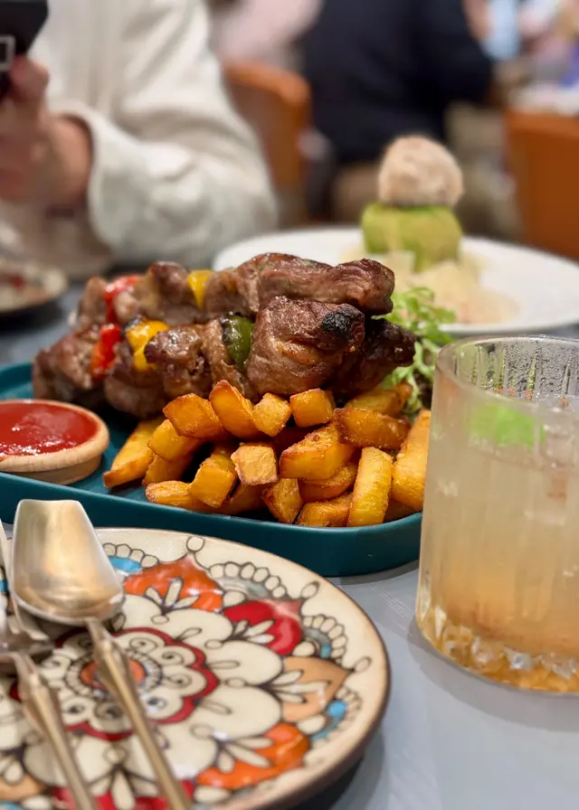 ・味道:個冰花酸梅汁係甜味為主,冇乜酸味,好似果香甜味醬汁,配豬肉又幾夾😙!好厚肉嘅巨大化串燒要咬幾嘢先食得晒一粒黑毛豬😂,但燒得勁嫩滑,咬落仲有肉汁同小小脂肪,甜醬又會中和咗個豬肉油脂香,有驚喜👍🏻!蕃薯條香甜脆口,內裡綿密🍠,好食😋