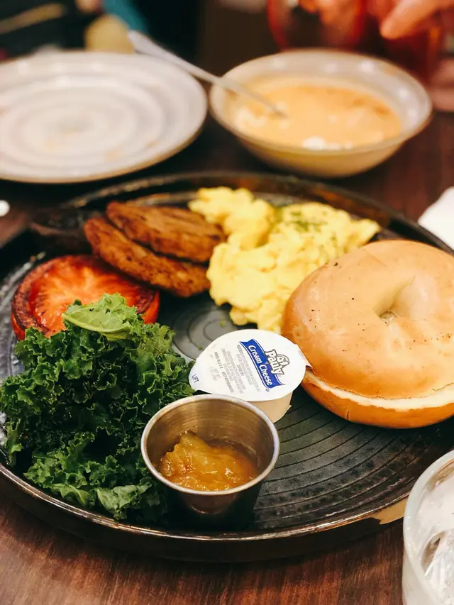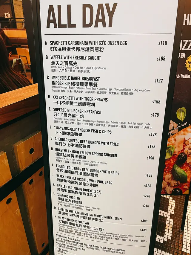 我們點了一份Impossible 豬柳貝果餐($122)和一份升cup晨光第一炮($178)