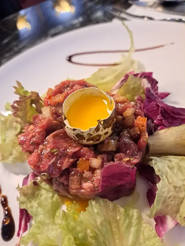💠自家製生牛肉他他 - 特別採用鵪鶉蛋黃🐣,混埋牛肉一齊食令牛肉口感滑溜肉質更軟嫩,調味帶點微辣清新開胃!😋