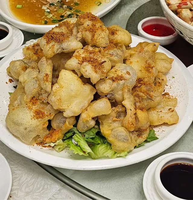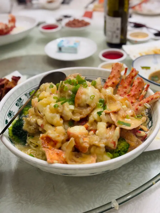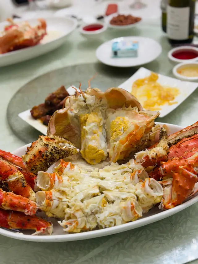 酒樓,每一碟都好大份,無論海鮮同埋炒小菜都好食🤤必叫長腳蟹,睇相已經見到爆曬膏,肉質鮮甜飽滿。另外椒鹽瀨尿蝦同九肚魚嘅調味好惹味,唔會過鹹,瀨尿蝦真係大過手掌嘅size,一隻可以兩個人share分,好滋味。上湯龍蝦伊麵既龍蝦肉好彈牙,伊麵吸收晒龍蝦精華湯汁!九肚魚有驚喜嘅係外層粉漿夠薄,裏面嘅魚肉滑嘟嘟!有米豬有糯米飯係底,乳豬皮脆卜卜,唔會切得太厚,食落亦唔會好油膩。小菜四碟包括海蜇、燻蹄、燒排骨同埋叉燒都係正常發揮,叉燒肉質軟嫩,肥瘦分明。今次係預先寫定菜單,總共有八道菜,海鮮有聖子、長腳蟹、九肚魚、龍蝦、瀨尿蝦,每位價錢約$1000。