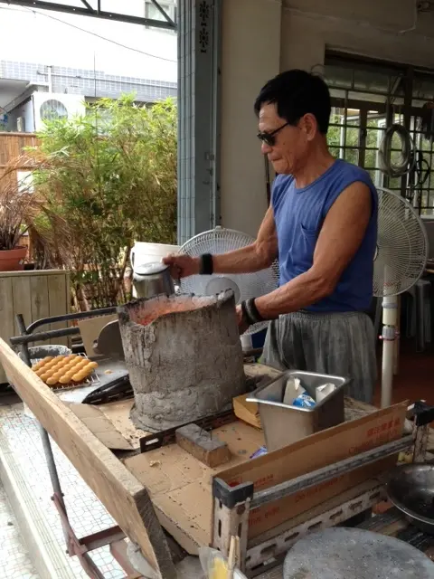 這個單看伯伯背後的兩把風扇、他戴的太陽眼鏡,還有炭爐噼噼啪啪迸飛著的點點星火就會了解。