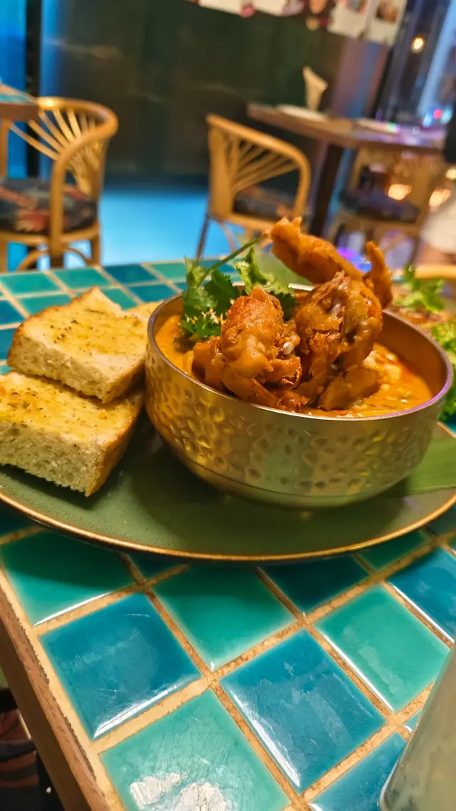軟殼蟹炸功到位,外層酥脆而不油膩。咖喱汁風味濃厚卻不過辣,搭配的蒜蓉包確實能完美吸附醬汁
