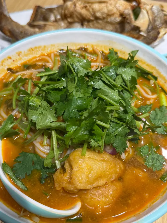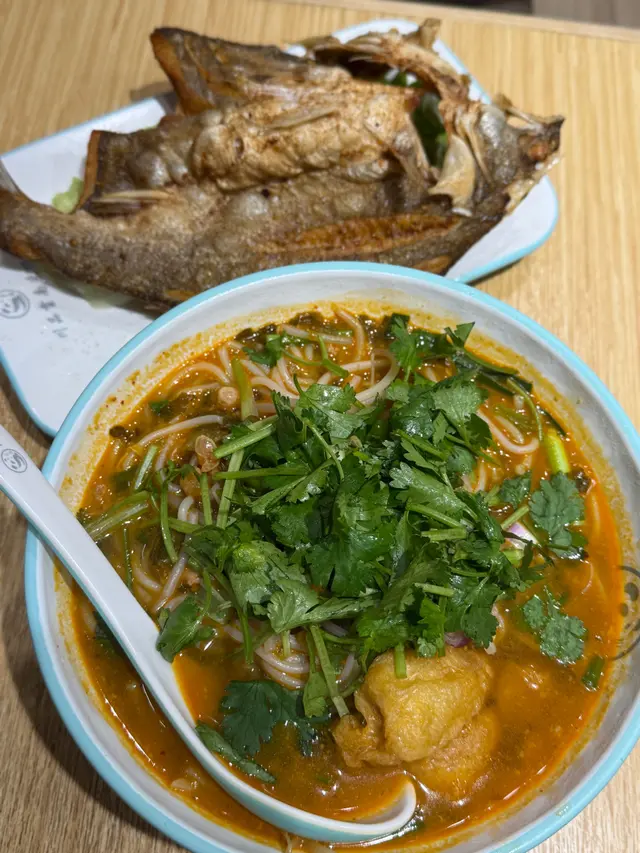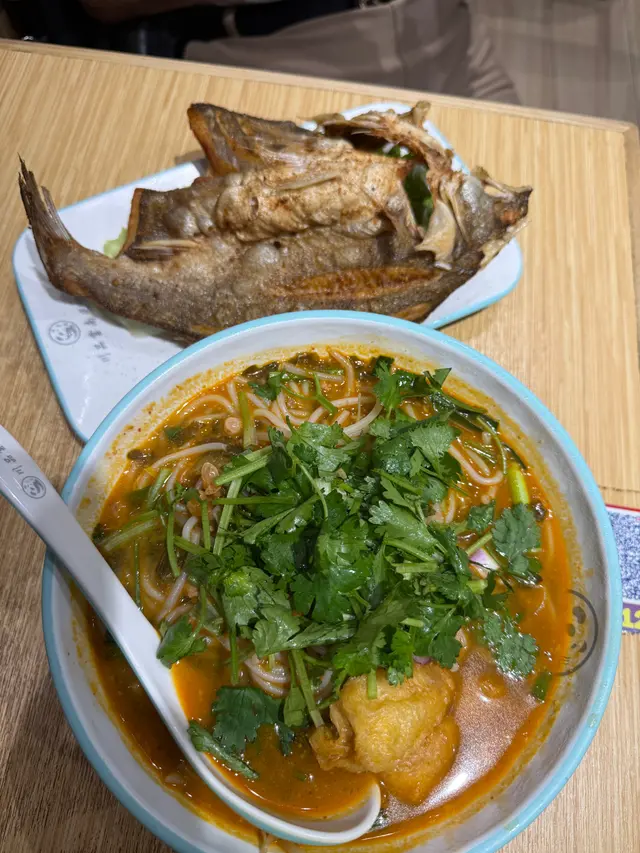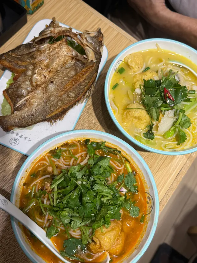 外酥內嫩的炸海鱸魚,香到不行!😍 米線搭 酸麻辣湯🌶️,麻辣過癮,酸爽帶勁!清湯(微微辣) 則溫和順口,適合想輕辣的朋友。🥣 加炸豆 脆脆的口感加分,蔥 和 芫茜 提香超讚!🧅🌿 最後來杯 凍豆漿🧊,濃郁清涼,完美收尾!😎