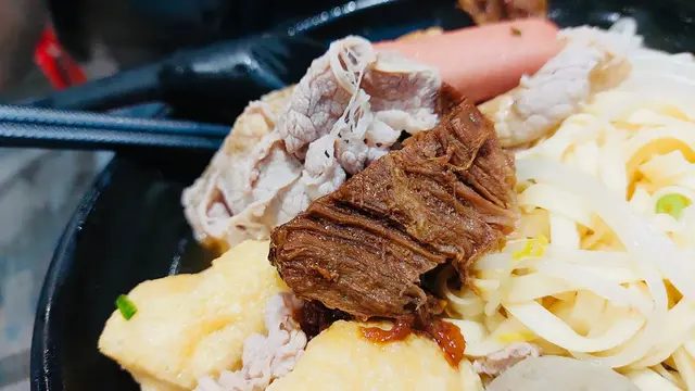 ~秘制牛腩、腸仔、手打牛丸、芽菜、豆卜配粗麵(清湯底)