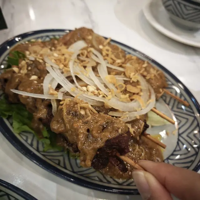 兩串豬頸肉、兩串牛肉,香茅+魚露+五香粉醃足一夜,炭火燒到焦邊滴油!一咬「啾」噴汁,豬肉肥香、牛肉嫩甜,4串直接讓你飛去胡志明市街頭!